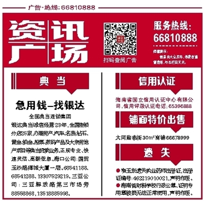 银达典当诚信经营23年,全国连锁分店25家,办理房产、汽车、名表、钻石、黄金、铂金、股票、数码产品及大宗房地产项目等典当贷款业务。正规专业、快速灵活、高额低息。海口公司:国贸玉沙路椰城大厦一层。68541188、68541288、13307529219。三亚公司:三亚解放路第三市场旁 88558868,13518885998。
