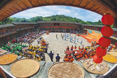 9月20日,在福建省大田县济阳乡济阳村“晒秋节”活动现场,人们表演节目庆丰收。