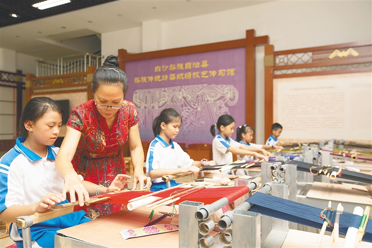 自2013年被白沙有关部门聘为黎锦授课教师以来,在过去7年的时间里,王瑞妹已为白沙各中小学校的学生们讲授了近千堂黎锦课程。“我文化水平不高,也不会用电脑做教案,但手把手地教孩子们学习黎锦技艺,这是我的强项。”王瑞妹介绍,自去年以来,每逢周一、二、五的下午4点至6点,她就被安排在该传习馆为白沙一小的孩子授课,有时还要赶赴其他乡镇学校给课后的孩子们传授黎锦技艺。