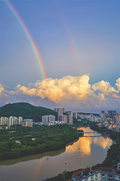大雨过后,大气中水汽含量高,光在大气中经过多次折射、反射,导致雨后的晚霞也格外的美丽。雨后空气清新,温度宜人,再伴与这样的美景,是海南人民独享的自然福利。