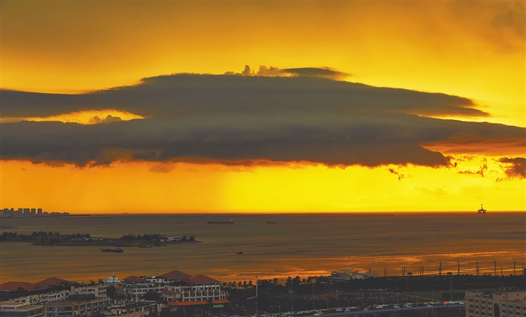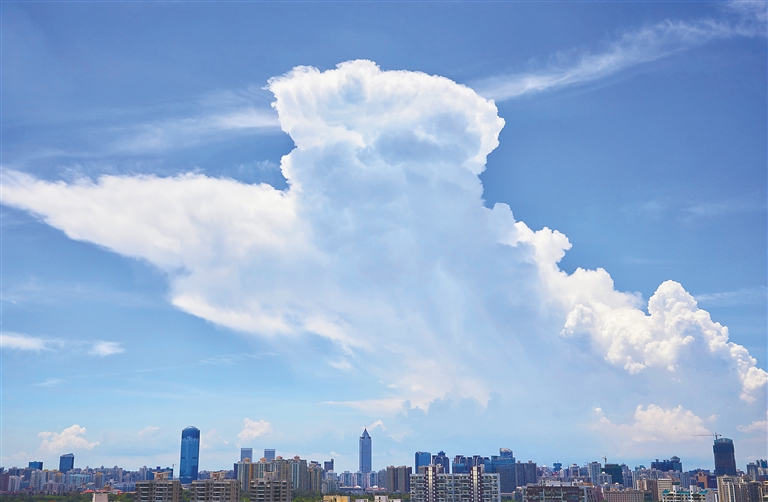海口上方出现的砧状云。砧状云是雷雨云的顶部冰晶结构,通常单体,呈马鬃状,因极像打铁的铁砧而得名,雷雨时多见。 |