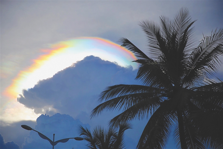 海口上空出现绚丽的“七彩祥云”,七彩云是云彩中的冰晶结构对太阳光线产生光的折射现象。海南日报记者 张茂 摄 |