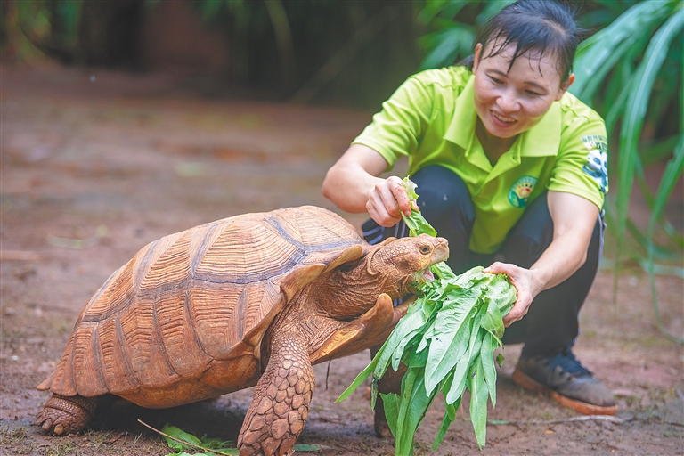 憨态可掬的棕熊、灵性十足的猕猴、悠然自得的苏卡达陆龟……在海南热带野生动植物园(以下简称海野动植物园)里,有一群特殊的“住客”。倘若你走近观察,从这些动物们安然自若的样子里,很难看出,它们都曾经历过一段流离失所的悲伤往事。