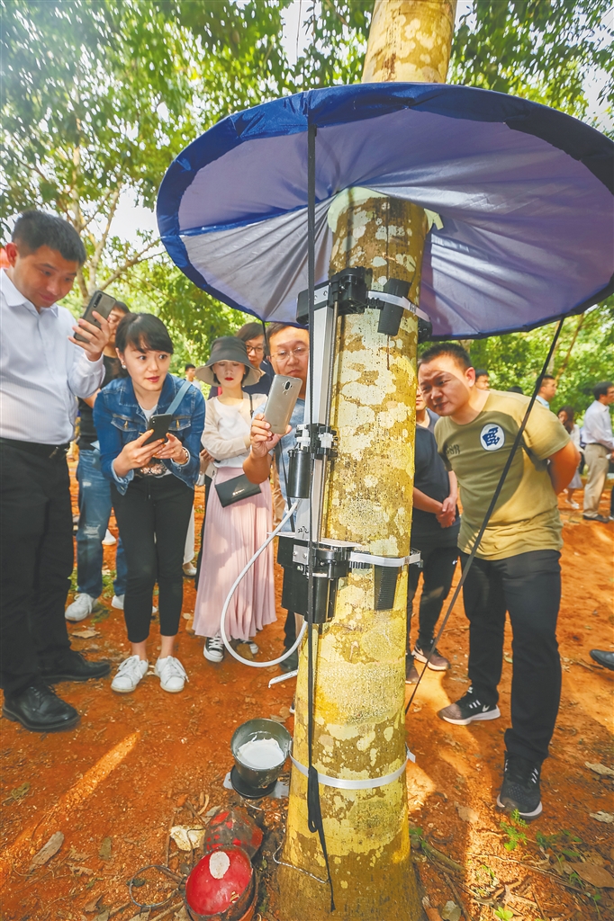 在橡胶收割环节,一机一树式“智能割胶机”和智能割胶机器人不仅可以解放生产力,还能在收割过程中对胶水产量进行大数据统计;