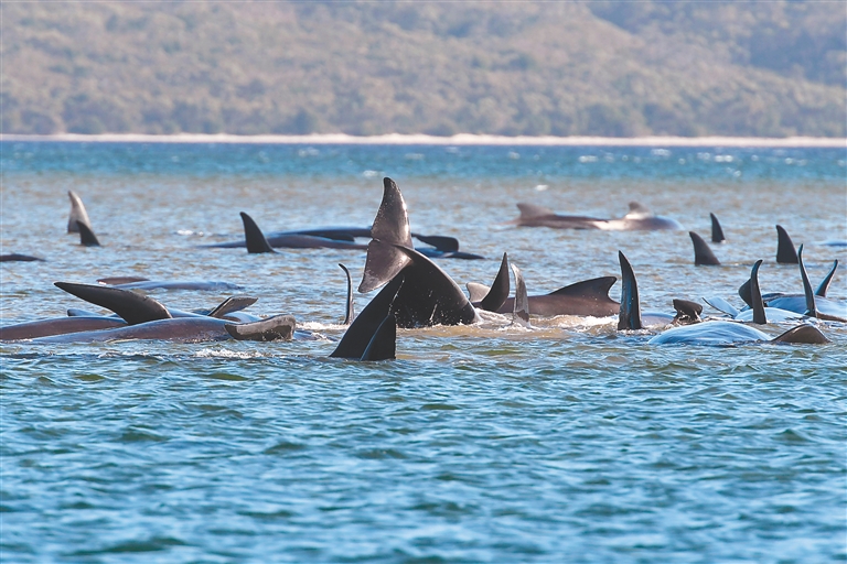 澳大利亚政府21日说,约70头鲸在塔斯马尼亚岛西部海港搁浅,海洋专家正研究如何救援。 新华社/美联