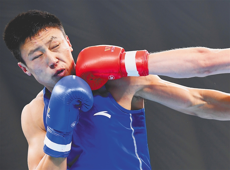 21日,在洛阳市举行的全国男子拳击锦标赛81公斤级半决赛中,内蒙古队叶尔波力伟山以2:3负于山东队王金祥(蓝衣),无缘决赛。新华社发