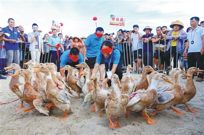 “开始计时,3、2、1!”裁判一声令下,吉一华和队友冲入场内,追、拦、抓,大家合作默契,一只只鸭子被抓住、放入鸭笼中,最终他们在短短22秒内将全部30只鸭子装进笼子里。据介绍,参与活动的各镇派出3名运动员,在蒙住眼睛的情况下,30秒内抓住鸭子,并放入鸭笼,放入鸭笼数量最多的队伍获胜。
