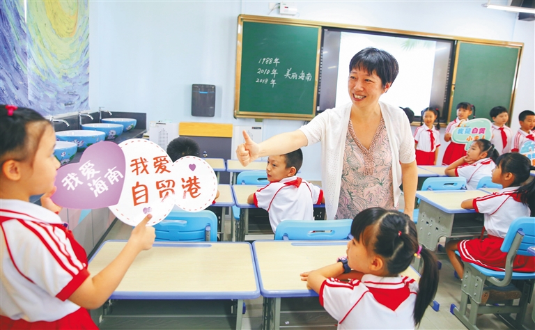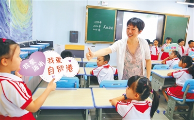 9月22日,在海口市英才小学滨江分校,阙平校长给二年级学生开展以“逐梦自贸港,争做好少年”为主题的班会课。 本报记者 张茂 摄