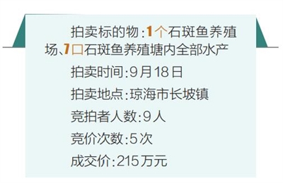 本报嘉积9月23日电 (记者刘梦晓 通讯员冼才华 吴秉育)为保全涉案财产价值,近日,琼海市涉黑涉恶案件财产处置领导小组处置工作组顺利完成“10·29”专案嫌疑人陈某、郭某万名下涉案“黑财”(1个石斑鱼养殖场、7口石斑鱼养殖塘内全部水产)的拍卖工作,该批“黑财”成交价215万元。