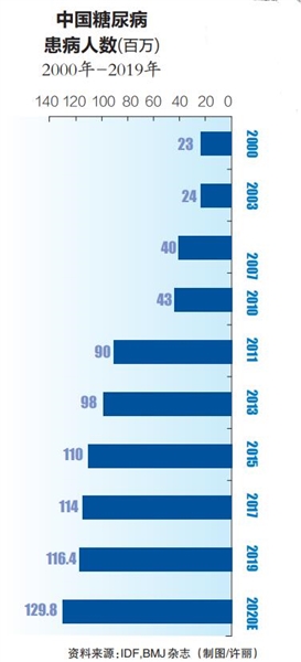 据国际糖尿病联盟数据显示,2019年中国糖尿病患者数约为1.164亿人,65岁以上糖尿病患者达3550万,均为全球第一。据BMJ杂志,2020年中国糖尿病患病人数将达到1.298亿,18岁及以上成人糖尿病患病率将高达12.8%。