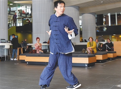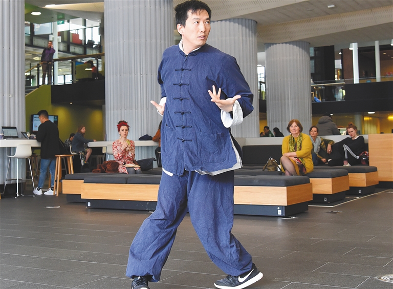 9月22日,孔子学院武术专职教师孟繁晓在新西兰惠灵顿维多利亚大学图书馆做武术展示。 新华社记者 郭磊 摄