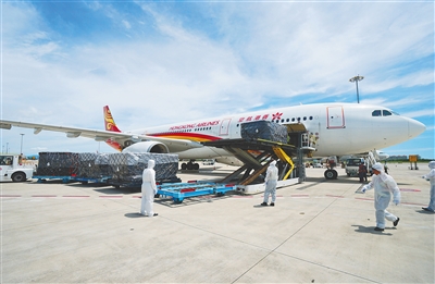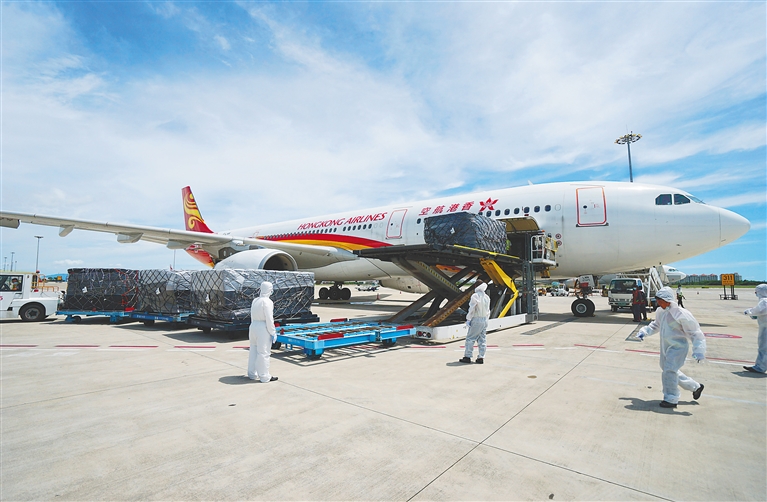 9月25日,由香港航空执飞的“客改货”包机满载免税商品顺利抵达三亚凤凰国际机场,这是该机场首次保障的地区航线“客改货”包机。