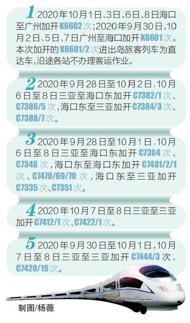本报海口9月25日讯 (记者邵长春 通讯员符转)海南日报记者9月25日从海南铁路海口车务段了解到,为满足国庆节期间旅客出行需求,海南铁路动态调整运力,进出岛旅客列车加开K6601/2次直达车,海南环岛高铁最高加开7对,具体信息如下:
