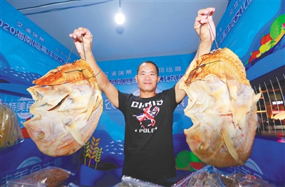 ④ 在农特美食大集上,渔民展示海产品红鱼。