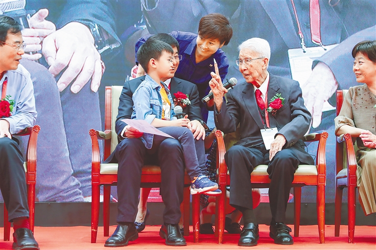 9月25日,在张金哲院士学术思想研讨会暨中华医学会小儿外科学分会第十六次全国小儿外科学术年会开幕式上,与会嘉宾和小儿外科界同仁共同为我国小儿外科创始人之一、国家儿童医学中心首都医科大学附属北京儿童医院主任医师张金哲院士庆贺百岁华诞。图为张金哲院士(右二)在活动上为孩子表演魔术。 新华社发