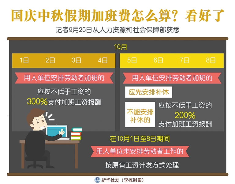 新华社北京9月25日电 (记者姜琳)今年国庆假期恰好“撞见”中秋节,假期叠在一起长达8天。如果因为工作原因,假期不得不加班,那么加班工资怎么计算?