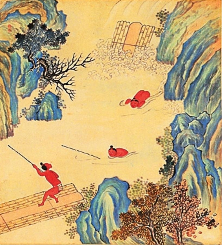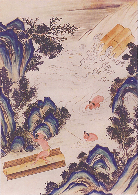 由于山区“瘴毒极恶”和“艰于攀附,易至伤生”,汉人畏惧瘴毒,不敢踏入黎族百姓聚集的地区直接进行采集运输,加上地势险恶,他们“不得不取资于黎人”采集运输黄花梨木。而“每伐一株,必经月而成材”,可以看出黄花梨木的珍贵和稀有,即便是有经验的黎族人,也要花费大量时间才能挑选出成材的木料。在图中,我们看见三名黎族青年,他们在运送至水上之前要“合众力推放”才能运到水中。木材本身十分沉重,顺着水流冲下来“声如山崩”,而“水急势重,人在水中为木所冲而毙,木亦随深没者。”可见黄花梨木运输的风险极大,不难想象昔日有多少黎族人为了采集黄花梨木葬身在山林里、溪水间。而运木一旦失败,不仅人可能丧失宝贵的生命,连已采集好的木材也会随着溪水流走,因此,古人慨叹道,“运木固未易易也。”