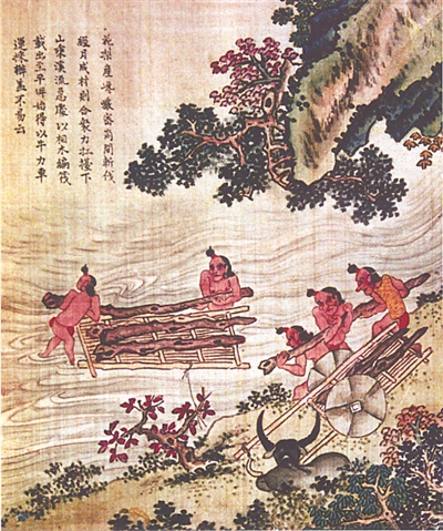 以上这三幅“运木图”,完整地呈现出黄花梨木从水路运输到陆路运输的过程。