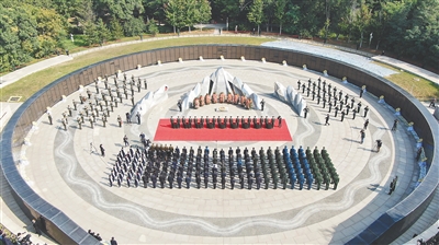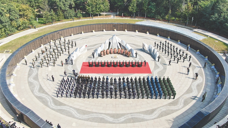 初秋的沈阳抗美援朝烈士陵园,苍松含悲,庄严肃穆。安葬仪式在陵园下沉式纪念广场举行。广场周围,环形的烈士英名墙下,摆放着黄白相间的菊花,参加仪式的人们肃穆站立,缅怀英烈,铭记历史。