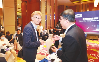 图❷ 9月29日,2020世界新能源汽车大会海南省新能源汽车产业国际专家咨询会议现场,嘉宾在会议间歇讨论交流。