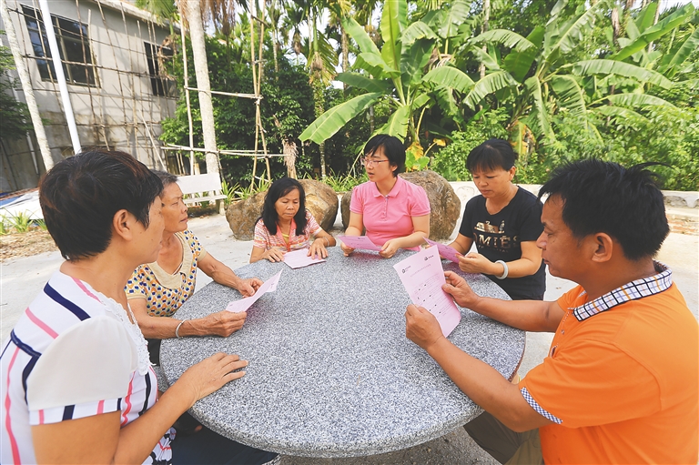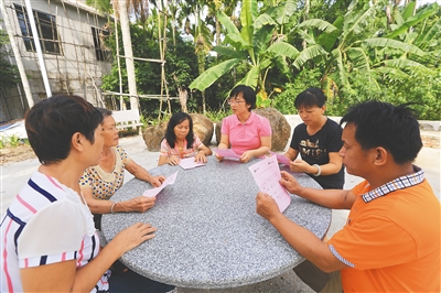 “阿婶,这是最新的帮扶政策,你有不明白的尽管问我。”近日,在定安县龙河镇水竹村文化广场的一角,几户贫困户围坐一桌,认真听着水竹村乡村振兴工作队队员胡秋影讲解扶贫政策。