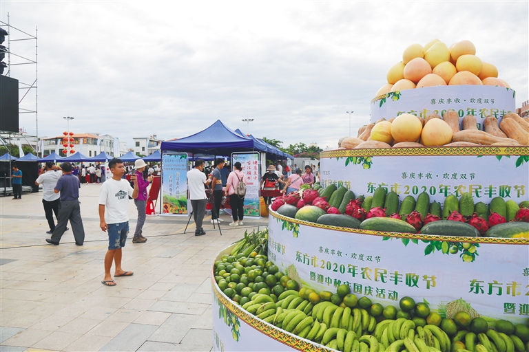 本报八所9月29日电 (见习记者肖开刚 刘婧姝)中秋国庆佳节未到,东方市已先热闹了起来。9月29日上午,东方市2020年农民丰收节暨迎中秋庆国庆活动在东方市民休闲广场举行。活动现场人头攒动,丰富诱人的特色美食、精彩纷呈的趣味活动,让所有人的脸上都洋溢着丰收的喜悦,提前感受到了中秋国庆佳节的喜庆氛围。
