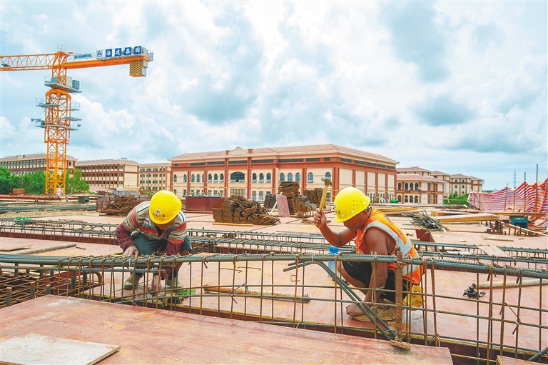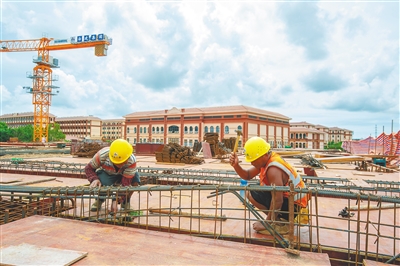以文昌国际航天城起步区范围为例,“三横五纵”路网工程(一期)项目正在稳步推进中。为加快建设步伐,整个工程有6个工作面同时开工,记者在施工现场看到,平整土地、打桩基、浇注混凝土,每一项工作都有五六个工人默契配合,挖掘机、混凝土搅拌车发出轰鸣。