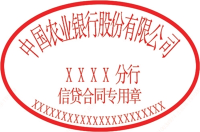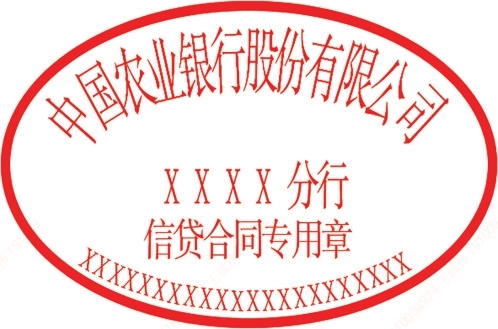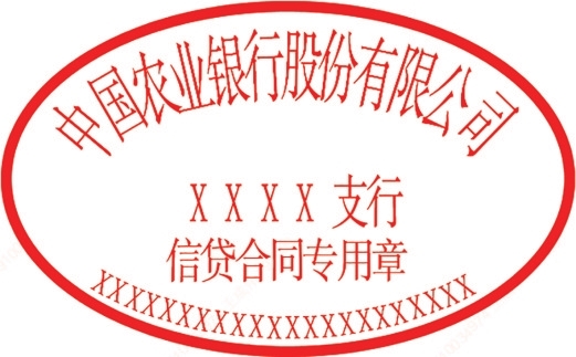 一、电子信贷合同专用章形状为椭圆形,内部包含我行机构名称、印章章名和业务验证码。印模颜色有红、蓝、黑三种,具有同等效力。其中红色印模样式示例如下: