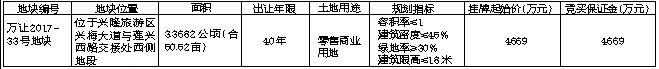 二、竞买人资格及竞买要求:1、竞买人资格:本次挂牌活动凡属中华人民共和国境内外的法人、自然人和其他组织(除法律另有规定者外)均可申请参加挂牌。属境外机构和个人(含港、澳、台地区)申请参与竞买的,按照规定需提交商务主管部门核发的《外商投资企业批准证书》和工商主管部门核发的《营业执照》。本次挂牌不接受联合竞买。失信被执行人不得参加本次项目竞买。2、竞买人要求:凡在万宁市境内已取得建设用地使用权满二年以上未投入开发建设造成土地闲置的,或者拖欠土地出让金未缴的,均不具备竞买人条件。该地块拟在兴隆地区建设咖啡相关产业项目。项目建成后,总建筑计容面积自持比例为25%,自持部分不得对外整体或者分割销售。竞买人需在签订《成交确认书》后与万宁市商务局签订《海南省产业项目发展和用地准入协议》,并严格按照《海南省产业项目发展和用地准入协议》约定内容进行开发建设,否则将承担相关违约责任。三、本次国有建设用地使用权挂牌出让设有底价,按照出价最高且不低于底价的原则确定竞得人。四、竞买咨询及报名期限:有意参加竞买者请到万宁市自然资源和规划局办公大楼用途管制和耕保组或海南省公共资源交易服务中心一楼受理大厅3号窗口查询和购取《万宁市国有建设用地使用权挂牌出让手册》,并按挂牌手册的具体要求报名参加竞买。 报名期限:2020年9月30日—2020年10月28日17:00(以竞买保证金实际到账为准)。五、竞买保证金:竞买人须按挂牌起始价全额支付竞买保证金,挂牌成交后,该竞买保证金转作土地出让金。六、资格确认:经审查,申请人按规定交纳竞买保证金,具备申请条件的,在 2020年10月28日17:30前确认其竞买资格。七、挂牌报价时间及地点:挂牌时间:起始时间:2020年10月20日8:30 时;截止时间:2020年10 月30日9:30时;挂牌地点:海南省政府会展楼二楼省公共资源交易服务中心土地交易厅进行。本次竞买活动只接受书面报价,不接受电话、邮寄、电子、口头等其他方式报价。受理报名、报价时间:报名报价期限内上午8:30至11:30 ,下午14:30至17:30(节假日除外)。本公告所指时间均为北京时间。八、其他需要公告的事项:1、该地块已经达到下列净地条件:安置补偿落实到位,土地权利清晰;不存在土壤污染,符合土壤环境质量要求;确认通水、通电、通路等,完成土地平整,具备动工开发必须的条件;已完成地上附着物清表,地上附着物已补偿到位,无法律经济纠纷。2、土地出让控制指标:零售商业产业投资强度指标应为≥300万元/亩,年度产值指标应为≥450万元/亩,年度税收指标应为≥12万元/亩。项目达产时间为签订《国有土地使用权出让合同》后的3年内。以上出让指标列入《海南省产业项目发展和用地准入协议》,属该协议内容的组成部分。3、根据《海南省住房和城乡建设厅海南省发展和改革委员会海南省自然资源和规划厅关于2019年推进装配式建筑有关工作事项的通知》(琼建科〔2019〕137号)等文件要求,总建筑面积在5万平方米及以上或单体建筑面积在3万平方米及以上的公共建筑应采用装配式方式建造。4、竞买成交当场签订《成交确认书》,并在30日内与我局签订《国有建设用地使用权出让合同》,按《国有建设用地使用权出让合同》约定开工,涉及水务、绿化、卫生、环境保护、消防安全、交通管理和设计施工等应符合国家、海南省的有关规定。九、本次挂牌事项如有变更,届时以变更公告为准。十、咨询方式:联系地址:万宁市万城镇望海大道南侧万宁市自然资源和规划局或海南省政府会展楼二楼省公共资源交易服务中心 咨询电话:0898-62217899 联 系 人:陈先生 查询网址:http://zw.hainan.gov.cn/ggzy/ http://lr.hainan.gov.cn http://www.landchina.com