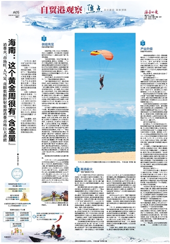 与此同时,乘坐直升机低空飞行、乘滑翔伞鸟瞰山海、游艇出海乘风破浪等海南旅游新玩法,也吸引众多年轻游客体验,大大拓展海南旅游消费空间;分界洲岛、三亚海昌梦幻海洋不夜城等景区纷纷延长营业时间,让游客们在浓厚的夜游氛围中感受不一样的假期度假方式……