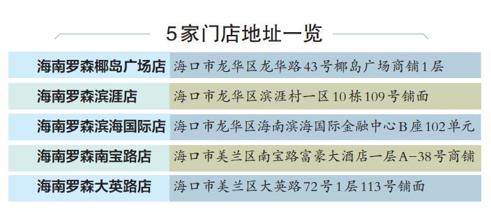 据了解,我省首批开业的5家罗森便利店分别为:海南罗森椰岛广场店,位于海口市龙华区龙华路43号椰岛广场商铺1层;海南罗森滨涯店,位于海口市龙华区滨涯村一区10栋109号铺面;海南罗森滨海国际店,位于海口市龙华区海南滨海国际金融中心B座102单元;海南罗森南宝路店,位于海口市美兰区南宝路富豪大酒店一层A-38号商铺;海南罗森大英路店,位于海口市美兰区大英路72号1层113号铺面。