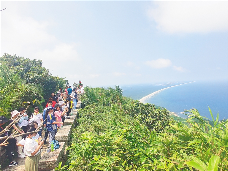 在铜鼓岭景区,俯瞰月亮湾,25公里长的海岸线蜿蜒曲折,如同一钩明亮的弯月。阳光下海上的细浪如一条条银白色的缎带,涟漪万千,揽月台和观海长廊上的游客,不时传来欢声笑语。“旅游热度持续攀升,国庆假期,我们这每天人头攒动。”该景区工作人员薛斌感慨,如画的山海生态美景,吸引来一拨拨游客争相拍照“打卡”。