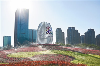 第三届数字中国建设峰会主会场福州海峡国际会展中心周边装扮一新(10月10日摄)。