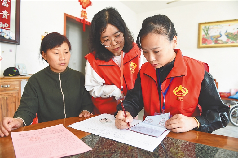 10月11日,安徽省合肥市肥西县花岗镇普查员、普查指导员在居民家中进行信息摸底。