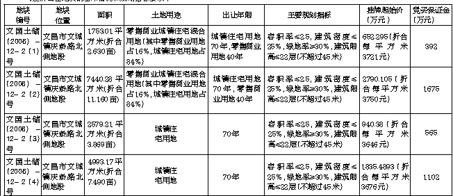 二、申请人资格:中华人民共和国境内外的法人、自然人或其他组织(法律另有规定者除外)均可申请参加竞买(注:失信被执行人不得参与本次竞买),申请人应单独申请竞买。本次挂牌不接受联合体竞买,不接受竞买人电话、邮寄、电子、口头报价。申请人应具备的其他条件:(一)申请人须具备竞买条件,并按规定缴交土地竞买保证金,经过审核我局将在规定的时间内确认其资格,签发竞买资格确认书。(二)该四宗地为非法占地、违法建设行为已经处置到位并组织供应的土地,原非法占地、违法建设行为人海南宇昌房地产开发有限公司及海南东泰嘉华房地产开发有限公司不得参与该四宗地竞买。(三)经政府相关部门核实,在文昌市境内申请人存在下列情形之一的,申请人及其控股股东禁止参加挂牌:(1)存在伪造公文骗取用地和非法倒卖土地等犯罪行为的;(2)存在非法转让土地使用权等违法行为的;(3)因企业原因造成土地闲置一年以上的;(4)开发建设企业违背出让合同约定条件开发利用土地的;(5)拖欠土地出让金的。三、本次国有建设用地使用权挂牌出让设有底价,并按照出价最高且不低于底价者得的原则确定竞得人。四、本次挂牌出让的详细资料和具体要求,详见挂牌出让手册。申请人可于2020年 10 月 12 日至2020年11月10日到海南省海口市国贸中心15C室或文昌市自然资源和规划局三楼土地利用管理室或海南省公共资源交易服务中心一楼受理大厅3号窗口咨询和购取挂牌出让手册,并按挂牌出让手册的具体要求报名参加竞买。五、申请人交纳竞买保证金的截止时间为2020年11月10日17时00分(以竞买保证金到账为准)。经审核,申请人按规定交纳竞买保证金,具备申请条件的,我局将在2020年11月10日17时30分前确认其竞买资格。六、本次国有建设用地使用权挂牌活动定于2020年11月2日8时30分至2020年11月12日15时30分在海南省政府会展楼二楼省公共资源交易服务中心土地交易厅进行。(2020年11月12日15时30分在海南省政府会展楼二楼省公共资源交易服务中心土地交易厅召开挂牌现场会)。七、开发建设要求:(一)本次出让的文国土储(2006)-12-2(1)、(2)号地块用途为零售商业城镇住宅混合用地(其中零售商业用地占16%,城镇住宅用地占84%);出让的文国土储(2006)-12-2(3)、(4)号地块用途为城镇住宅用地。该四宗地均作为“银河金座”项目整合用地。竞得土地后,竞得人须严格按照“银河金座”项目规划设计方案要求,在一年内动工建设项目,两年内完成项目的投资建设,彻底解决“银河金座”项目配套设施未完善、规划未验收、逾期未办证等历史遗留问题。不按批准的项目规划设计要求进行开发建设,以及不履行《国有建设用地使用权出让合同》约定的,报经市政府批准后,按该合同约定,退还除该合同约定的定金以外的全部或部分国有建设用地使用权出让价款(不计利息),收回国有建设用地使用权;受让人造成土地闲置,闲置满1年不满2年的,依法缴纳土地闲置费;土地闲置满2年且未开工建设的,出让人有权无偿收回国有建设用地使用权。(二)按照《关于印发<海南省建设用地出让控制标准(试行)>的通知》(琼国土资规〔2018〕7号)和《关于实施产业项目发展和用地准入协议的指导意见》(琼国土资规〔2018〕8号)有关规定,本次出让宗地零售商业城镇住宅混合项目用地和城镇住宅项目用地控制指标,投资强度为不低于500万元/亩,不设定年度产值指标和年度税收指标,开发建设的项目产值和税收征缴按照现行有关法规政策规定执行,达产年限5年。以上控制指标按规定列入《产业项目发展和用地准入协议》,属于协议内容的组成部分,竞得人在签订国有土地使用权出让合同时,一并与文昌市住建局签订《产业项目发展和用地准入协议》。(三)竞得土地后,竞得人须在文昌注册公司进行项目开发,拟注册成立新公司进行开发建设的,申请人应在申请书中明确新公司的出资构成、成立时间等内容。如已在文昌注册具有相应土地开发资质的公司,可不再注册公司。(四)竞得土地后,竞得人须按规定完善该宗地施工报建、地质、压覆矿、消防、环保等审批手续,方可动工建设。(五)该四宗地的竞得方应采用装配式方式建造。八、其他需要公告的事项:(一)本次出让宗地按净地条件出让,即土地权利清晰、安置补偿落实到位、地上附着物清表、无法律经济纠纷、土地开发利用规划条件明确、符合土壤环境质量要求、具备动工开发所必需条件。竞买人应当现场踏勘出让地块,竞买人申请参加竞买的,视为对出让地块净地条件无异议。(二)竞得土地后,竞得人须按照签订的《成交确认书》约定与文昌市自然资源和规划局签订《国有建设用地使用权出让合同》,按合同约定及时缴纳土地出让金。(三)出让价款缴纳:土地出让成交后,必须在20个工作日内签订出让合同,合同签订后30天内必须缴纳出让价款60%的首付款,余款要按合同约定及时缴纳。分期支付国有建设用地使用权出让价款的,受让人在支付第二期及以后各期国有建设用地使用权出让价款时,同意按照支付第一期土地出让价款之日中国人民银行公布的贷款利率,向出让人支付利息。(四)本次挂牌出让事项如有变更,届时以变更公告为准。(五)本公告未尽事宜详见《文昌市国有建设用地使用权挂牌出让手册》,该手册所载内容为本公告的组成部分。九、联系方式:联系地