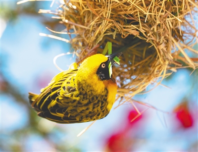 肯尼亚甜水自然保护区的一只鸟在筑巢(2019年9月29日拍摄)。