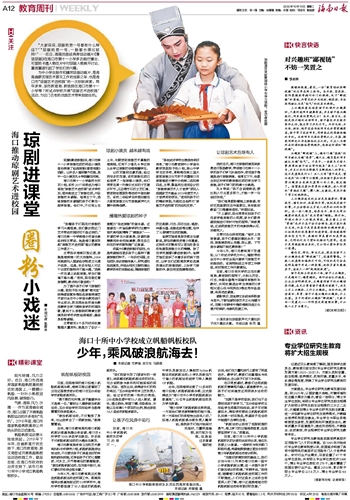 目前,海口市10所中小学帆船帆板校队的训练均由政府出资,每位队员要上16堂课。一些学校与有关部门积极沟通,希望能探索建立更加长效的青少年帆船帆板运动培训机制。
