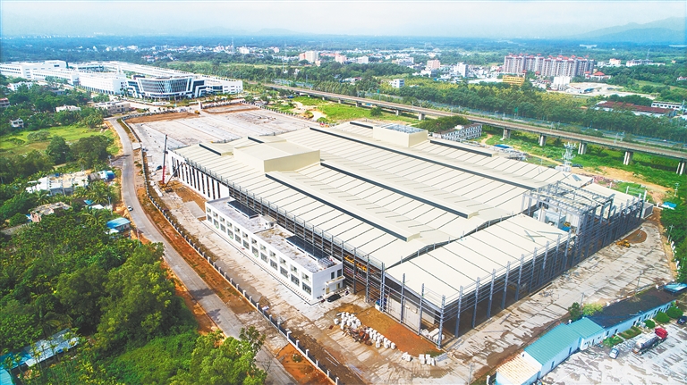 10月15日,俯瞰位于万宁市礼纪镇工业区的海建(万宁)建筑产业现代化基地项目工地,工人正在进行收尾施工。据了解,该项目将于本月内投产运营。