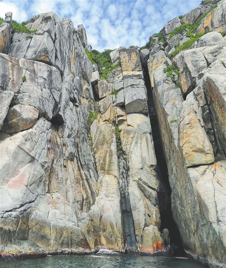 护岛员刘名琳行走在海边。偶尔,几只黑色的金丝燕从铅灰色的石壁中掠出,发出似织针在梳子上横拉而过的“嗒嗒”声。他总会循声望去,享受岛上这难得的“喧嚣”时刻。这里两岭三峰枕海壁立,一条长800米、宽40米的弓形银色沙洲横贯其间,这里是位于万宁市东南部的大洲岛,一座海南岛沿海离岸最大的岛屿。