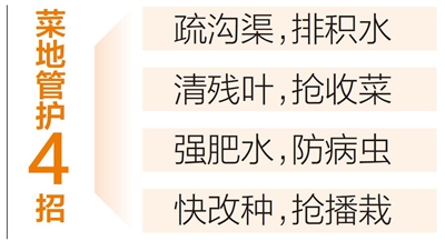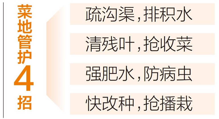 省农业科学院蔬菜研究所博士孙晓东指出,台风过后,农户应对叶菜科学防控消除病虫,因地制宜改种复产。在施肥上应注意不能偏重、过量,否则容易引起肥害。及时清理坏死菜地,抢晴翻耕晒地,撒施石灰氮消毒。安排好播种期,优先安排种植生长期短、生长快、产量高且抗病虫和抗逆性强的品种,确保蔬菜供给。有条件的菜农可应用设施栽培技术育苗和栽培,以确保蔬菜及时上市。