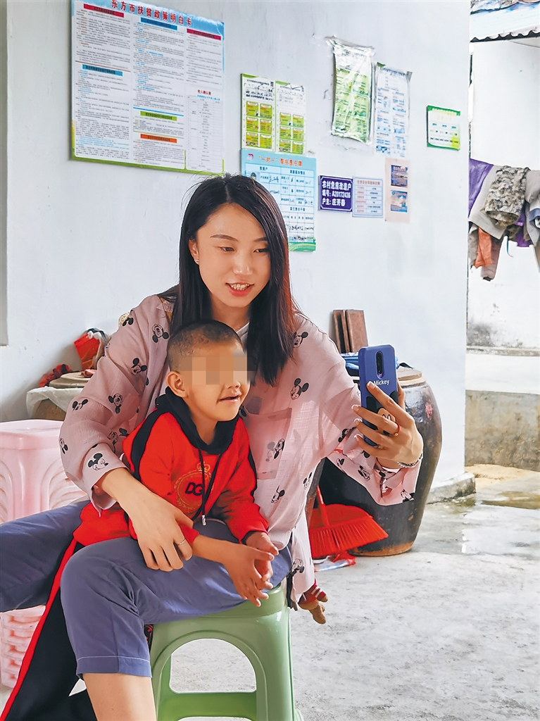 因为都是建档立卡贫困户,不少特殊儿童要么跟着家人干农活,要么自顾自地玩耍,家里都没人。打了几通电话联系,孩子和家长都迅速赶了回来,开心地向老师“报到”。特殊儿童不同于一般的孩子,往往难以正常交流,因此张萌和何文洁都随身带着不少小玩具,专门用于和孩子们拉近关系。