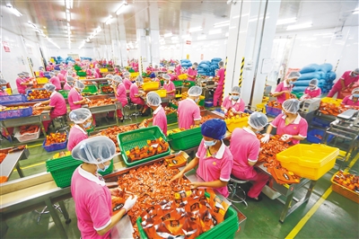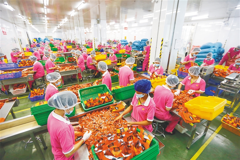 在万宁市东澳镇,今年10月1日刚刚建成投产的口味王槟榔加工厂二期基地内,工人们正铆足劲加工槟榔产品。这些产品将远销国内其他地区。