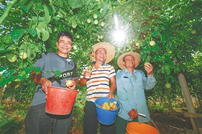 “又到台风季,必须做好雨季管理。”近日,台风“浪卡”过后,在万宁市北大镇北大村,脱贫村民刘运明仔细巡查村内的百香果示范种植基地,查看是否存在积水的情况。刘运明是这个基地的技术员,一年工资性收入加上自家种植百香果的获利,超过10万元。
