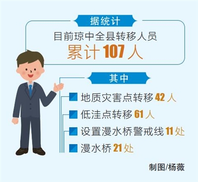 据统计,目前琼中全县转移人员累计107人,其中地质灾害点转移42人、低洼点转移61人,设置漫水桥警戒线11处,漫水桥21处。