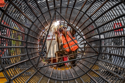 该段工程于2020年6月1日正式开工,年度计划完成施工产值2.16亿元,截至目前已累计完成年度施工计划的53.03%。图为在文临高速公路文昌段项目施工现场,工人正在焊接钢筋。