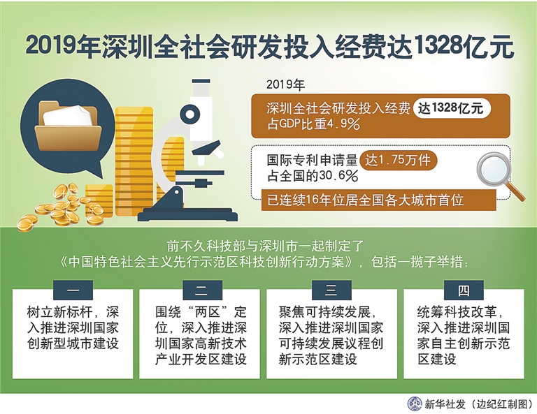 2019年深圳全社会研发投入经费达1328亿元,占GDP比重达4.9%;深圳国际专利申请量已16年位居全国各大城市首位;拥有国家高新技术企业1.7万家,科技型中小企业超过5万家……深圳的科技创新工作走在全国前列。