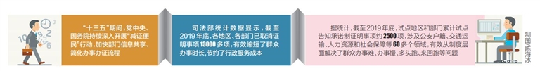 “十三五”期间,党中央、国务院持续深入开展“减证便民”行动,加快部门信息共享、简化办事办证流程。司法部统计数据显示,截至2019年底,各地区、各部门已取消证明事项13000多项,有效缩短了群众办事时长,节约了行政服务成本。