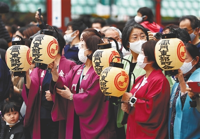10月18日,在日本东京的浅草寺,人们戴着口罩参加“三社祭”庆典活动。