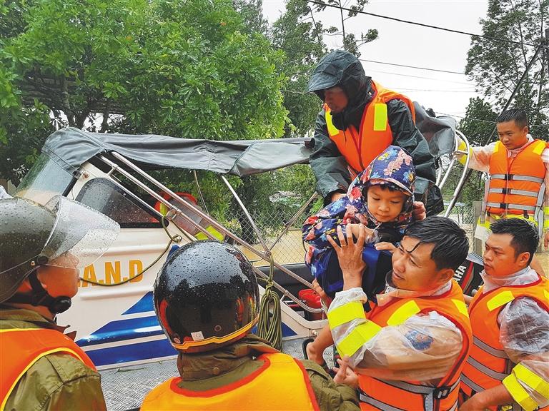 10月17日,在越南中部广治省,救援人员转移受洪灾影响的居民。