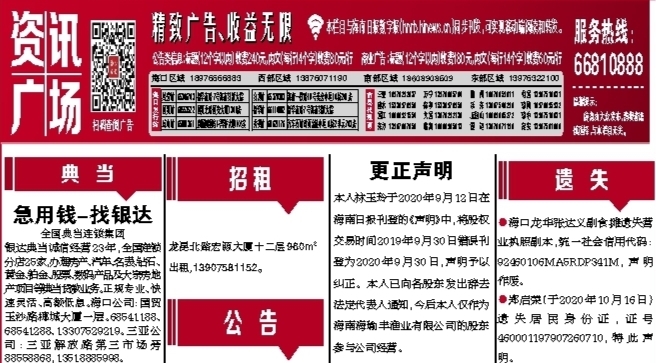 本人林玉玲于2020年9月12日在海南日报刊登的《声明》中,将股权交易时间2019年9月30日错误刊登为2020年9月30日,声明予以纠正。本人已向各股东发出辞去法定代表人通知,今后本人仅作为海南海瑜丰渔业有限公司的股东参与公司经营。